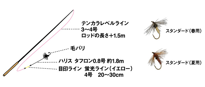 下流に向かって流す釣り方は流れの抵抗を利用して、流れに毛バリを横切らせることで渓流魚にアピールするテクニック。スタンダードタイプの毛バリをポイントの上流やや沖目に落として沈めて、ラインにタルミを作った状態で毛バリを送り込みながらポイントでアピールさせる。テーパーラインや手元にダイレクトにアタリを感じることができる刺激的なテクニックである。