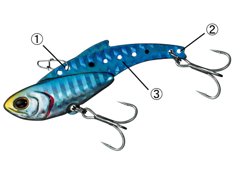 ツーウェイラインアイ(スナップ標準装備)。前:ノーマルアクション(速引き対応)、シャロー引き 後:ワイドアクション、デッドスロー