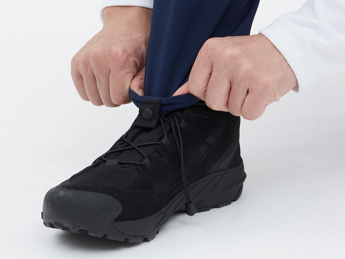 本体は摩耗に強いCORDURA素材を採用。(撥水機能付き)裾にはシューズと連結できるループ付きで、靴内への草や砂、水等の侵入を軽減。