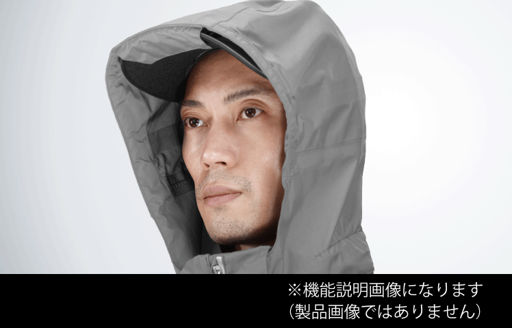 キャップインシステム対応のウエアのフードと合体。フードと頭部の動きを同調させることで視界を確保します。