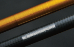 へらの突っ込みに対して“節が最も働く位置”に極薄カーボンシートをリング状に数か所巻きつけることで素材のツブレを制御し、へらを早い段階で止め、浮かすことで、軽量化を進めながらパワーアップを実現している。(各節によってカーボンシートの厚さ・弾性・幅は異なり、部位によりカーボン素材内層に組み込まれて外観では分からない場合もあります。写真は「ヘラFX」の例です。)