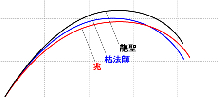 「兆」は「龍聖」と同じくオールラウンダーを謳う竿である。そして両者の差はズバリ、その掛けカーブに表れている。同じ硬式オールラウンダーでありながら、先にスッと抜ける先調子的な楕円形を描く「龍聖」に対し、「兆」は胴に乗ってくるふくよかな胴調子的楕円。よりシャープでスピーディな取り込みなら「龍聖」、よりゆったりと曲がりを楽しむなら「兆」、という棲み分けとなるだろう。T.P.Oに応じて使い分けるもよし。純粋に好みで選ぶもよし。「兆」と「龍聖」のコンビがへら竿の歴史の新たなる幕開けを告げる。