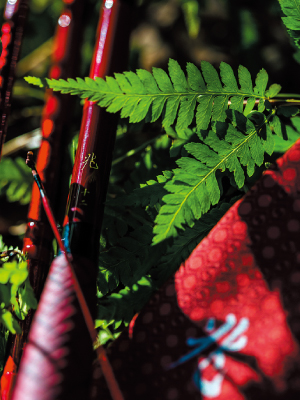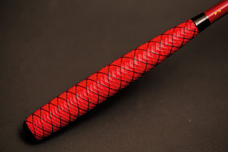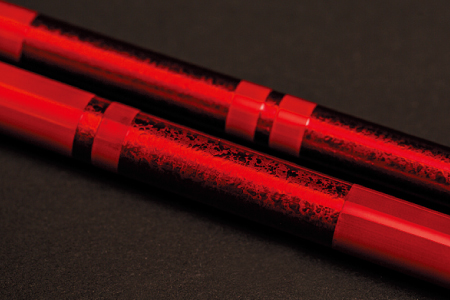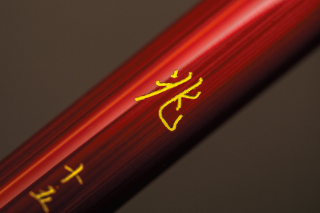 「兆」はこれからの時代を切り開くべく、“煌びやかな和”をコンセプトに、唯一無二の存在でありながら、懐かしさと新鮮さが同居する意匠を身にまとった。竿全体は重厚かつ鮮やかな朱の総塗段巻で覆われている。よく目を凝らしてみれば、ただの総塗り仕上げではなく、光輝性研ぎ出し風の仕上げや段塗りの朱にまで微妙に色合いが変化していく手の込んだ仕上げが施されていることに気付く。そして大切な「兆」の銘は、竹地に朱の漆を塗ったかのような外観の上に鮮やかな黄色の色入れとともに「兆」ならではの華やかさが踊るこだわりの仕上げが目を見張らせる。