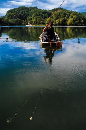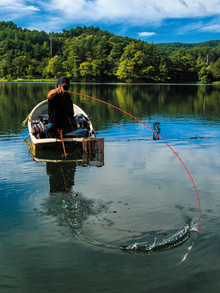 ここ十数年でへらぶな釣りにおける“感覚”は、大きく分けてふたつ変わったと言われる。ひとつは、エサを“抜く・持たせる”という「エサ使い感」。そしてもうひとつは、大型べらに対するタメを重視した“やりとり感”だ。スッと先に抜ける感触が特徴の『株理論』の竿にあって、「兆」はある意味、異端。しなやかで、優しい、実に不思議な感触である。そしてこの新たに求められた感触こそ、現代へらぶな釣りにおけるひとつの回答であった。たとえば浅いタナやチョウチンでエサを振り込む時、浮きの立つ位置にエサを落とす、いわゆる落とし込みが一般的となる。ベテランへら師であれば熟練の竿捌きで当たり前の技術であるが、よりシビアなエサ付けと食わせのシンクロが要求されるセット釣り、軟らかいエサをいかにタナまで持たせるかが問われる両ダンゴなど、年々エサ使いのシビアさが増す状況下、へら竿にはエサを“置きにいく”優しい落とし込みこそが新たに求められている。