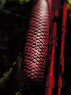さらに「兆」には機能を伴った新たな意匠も加わった。黒糸のステッチがアクセントとなったまったく新しい握りは、その凹凸感と最新の塗料の組み合わせによって、これまでにない優しい握り心地を実現。現代のへらぶな釣りに要求される1目盛り単位の繊細な誘い、風や流れを読んだ振り込み、長尺ではへら師の身体の負担軽減に大きく寄与してくれるだろう。そして何よりも、握りに軽く手を添え静かにアタリを待つ時間さえも、充実した優雅なものに変えてしまうだろう。
