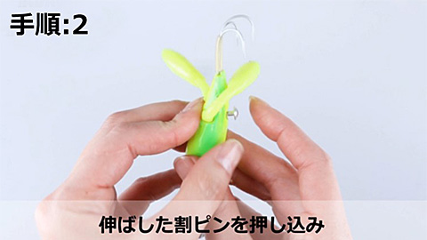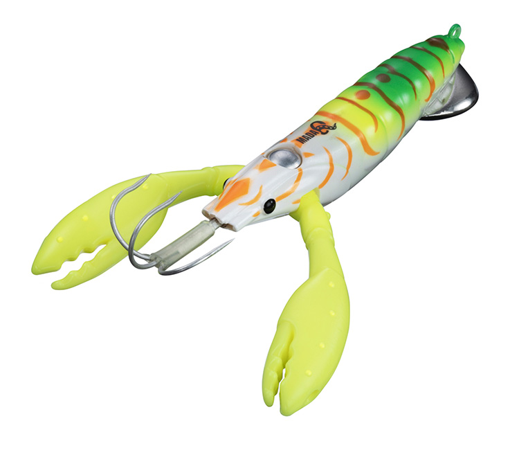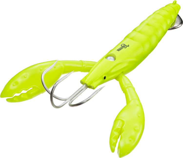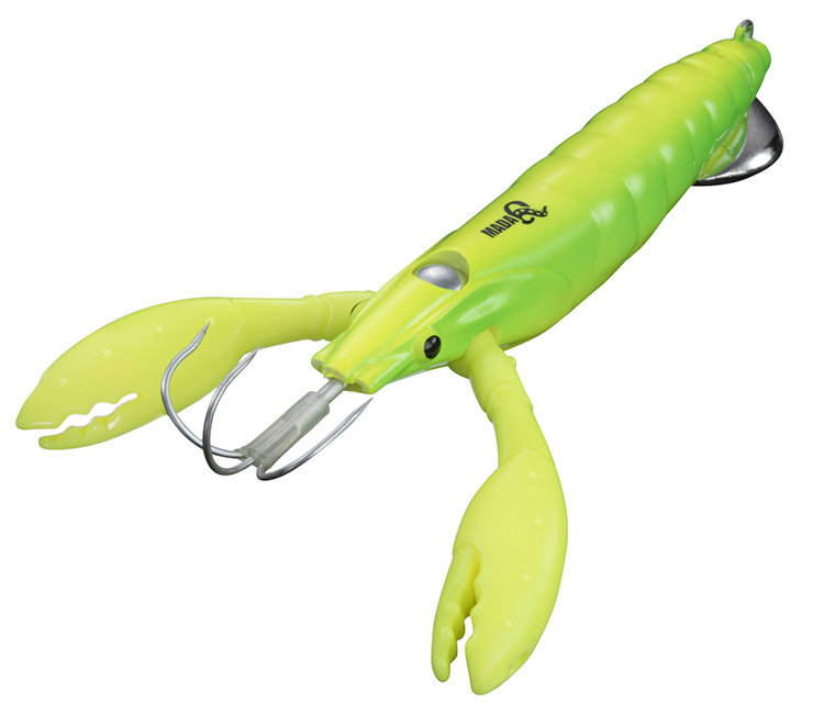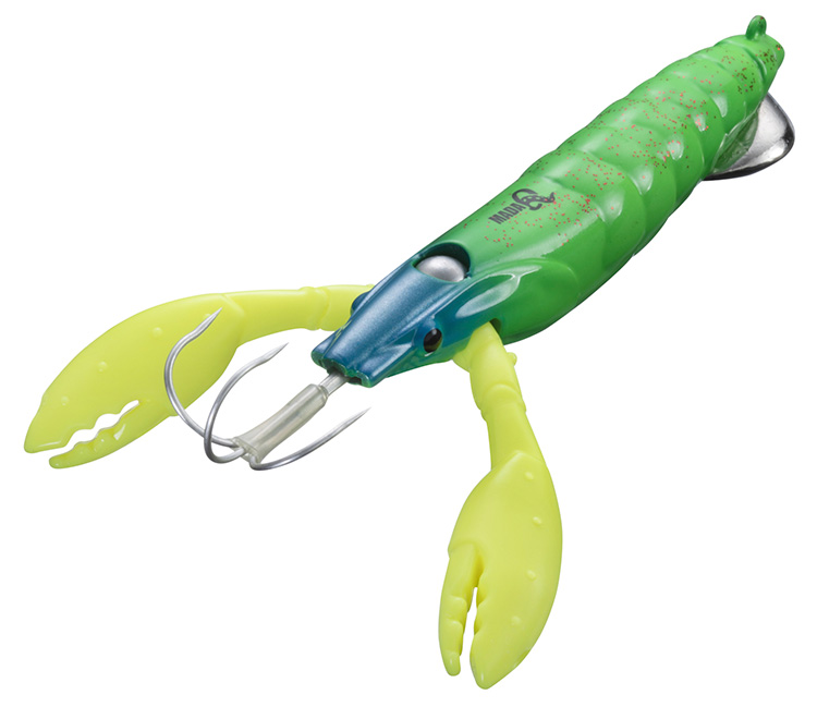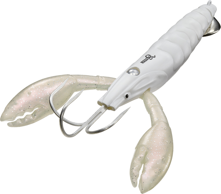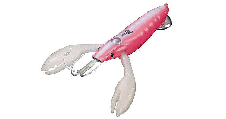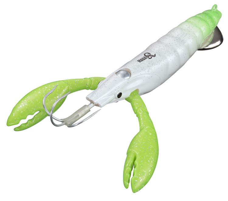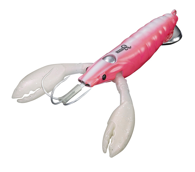 マダクは、ワーム素材でできた爪とファインワイヤーで作られた専用半傘タイプカエシ無しトリプルフックがボディに配されており、1本のアルミ製割りピンで止められている。