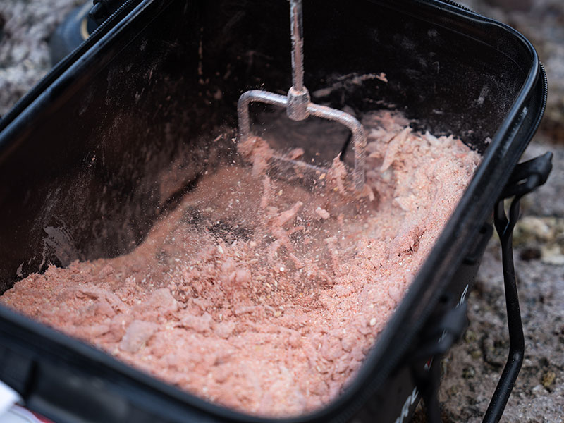 さらに遠投させるには、ヒシャクを振るスピードを上げる必要があります。ヒシャクを早く振った際に圧縮が弱いと、空中分解してバラバラになり狙ったポイントにコマセを届かせることができません。コマセを分解させないために、コマセプレスボードを使用して圧縮し硬いコマセを作る必要があります。