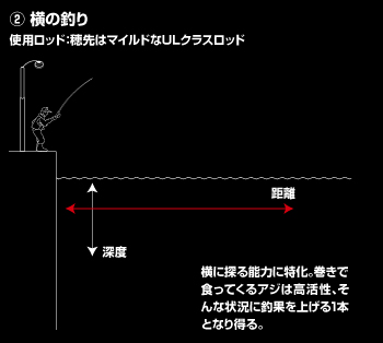 同じ常夜灯まわりのジグヘッドを主体とした釣りでも、アジが高活性で浮き気味のときは「横の釣り」の方が断然、効率がいい。これは着水したらそのままリトリーブしてくるという、いわばド定番の釣りである。「縦の釣り」に使うロッドでももちろん可能だが、張りのあるロッドだとバイトを弾いて乗せ切れない場面が出てくる。しなやかなティップを持ち、スイープにフッキングできるロッドが最適である。