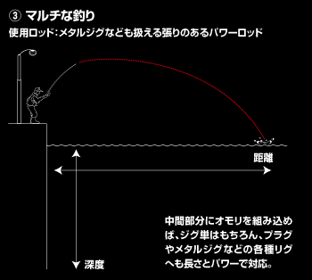 どうしてもジグ単が出来ない場合、大物狙いの場合はどうか? ジグ単では攻めきれないディープエリアの攻略、沖の潮目や流れを狙うなどのポイントが遠い場合や、風の強い日にはリグに重さがほしい時などは、アジが吸い込みやすいように針まわりは軽量にしておきたい。つまりジグヘッドを重くするのではなく、キャロやスプリットなど、中間部分にオモリを組み込むリグを使用することになる。するとリグ自体が重く、長くなるので、ロッドは7フィート台中盤から8フィートの長さで、パワーのあるものを用意したいところだ。それにひと口にアジといっても、手のひらサイズから40~50cmのメガ級まで、サイズはさまざま。こういったリグや、初めから大物狙いのメタルジグを扱えるパワフルなロッドながら、「マルチな釣り」ができる。
