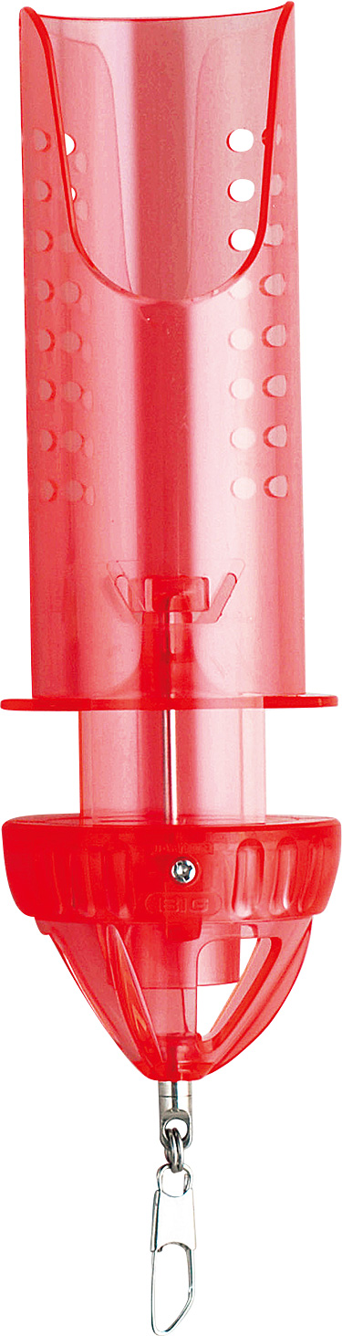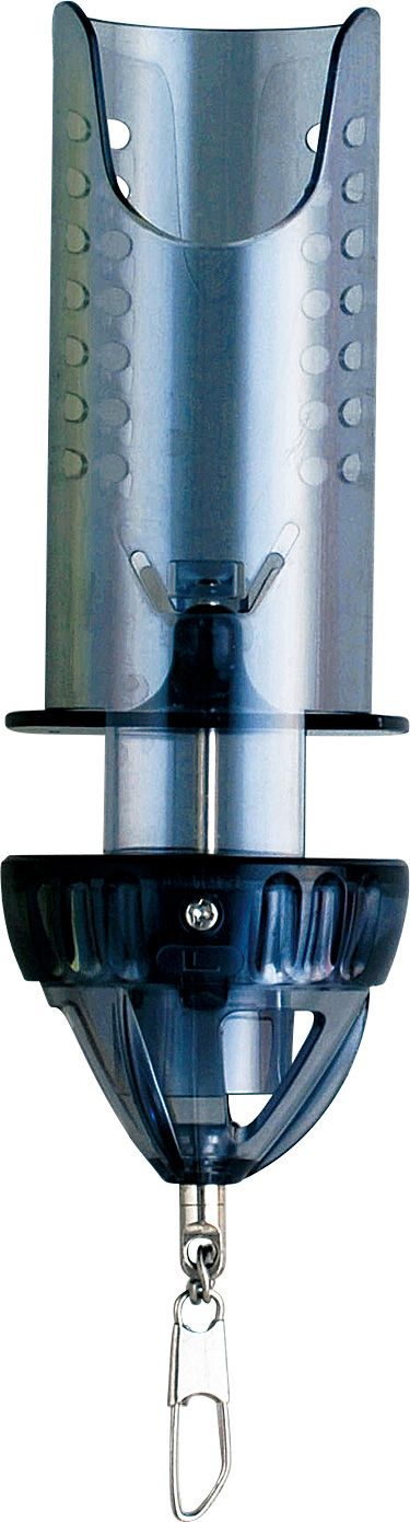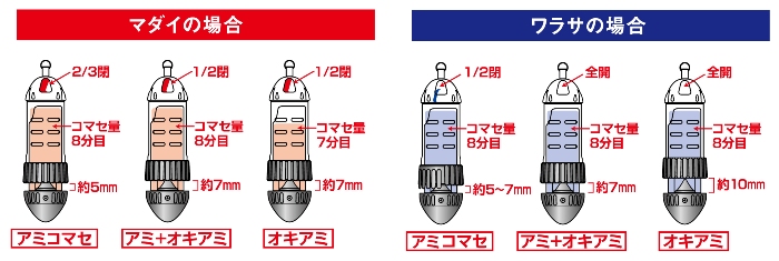 上下の調整リングの開き具合を調整することにより、対象魚やコマセの種類に応じた放出量の調整が自由自在。アミコマセ、オキアミ、アミ+オキアミのいずれにも対応。