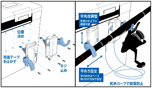 堤防や海釣り公園などの釣りでクーラーにちょっと竿を掛けられる便利アイテム。