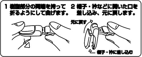 キャップとウェアの襟などをとめておくことで、キャップが風で飛ばされるのを防ぐ。