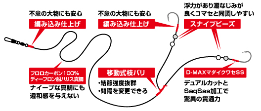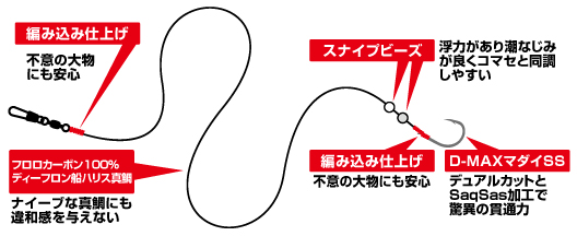 フックは“驚異の貫通力”SaqSas(サクサス)&針先デュアルカット仕様の「D-MAXマダイクワセSS」採用。