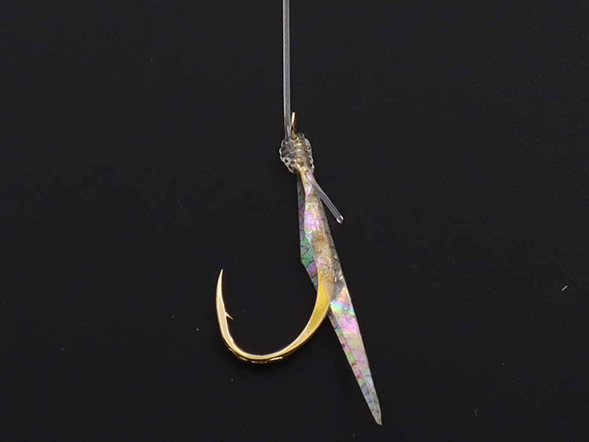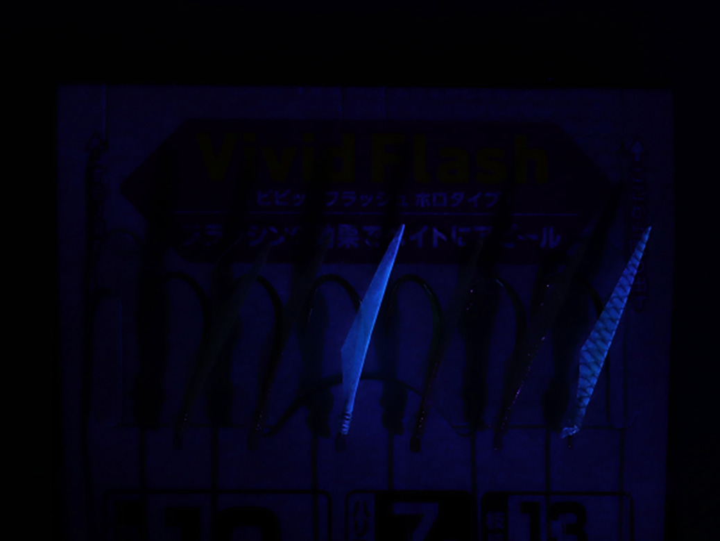 針の胴打ち部分に光沢のあるホログラムシールを直貼りし、ベイト(エサ)掛かりが飛躍的にアップする仕様になっている。