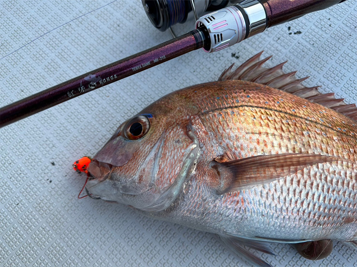 そして何より、最大のメリットは「楽しいこと!」これが一番である。ライトゲームロッドが浸透した背景がそうであったように、竿が短く軽いからこそファイトにダイレクト感が生まれ、鯛のエネルギッシュな引きを思う存分楽しむことができる。MH-215は元々、初心者用に開発しようと大島テスターと共に企画担当に提言したのだが、私たちテスター陣もこの楽しさに魅了され、テストではMH-215の取り合いになってしまったほどである。