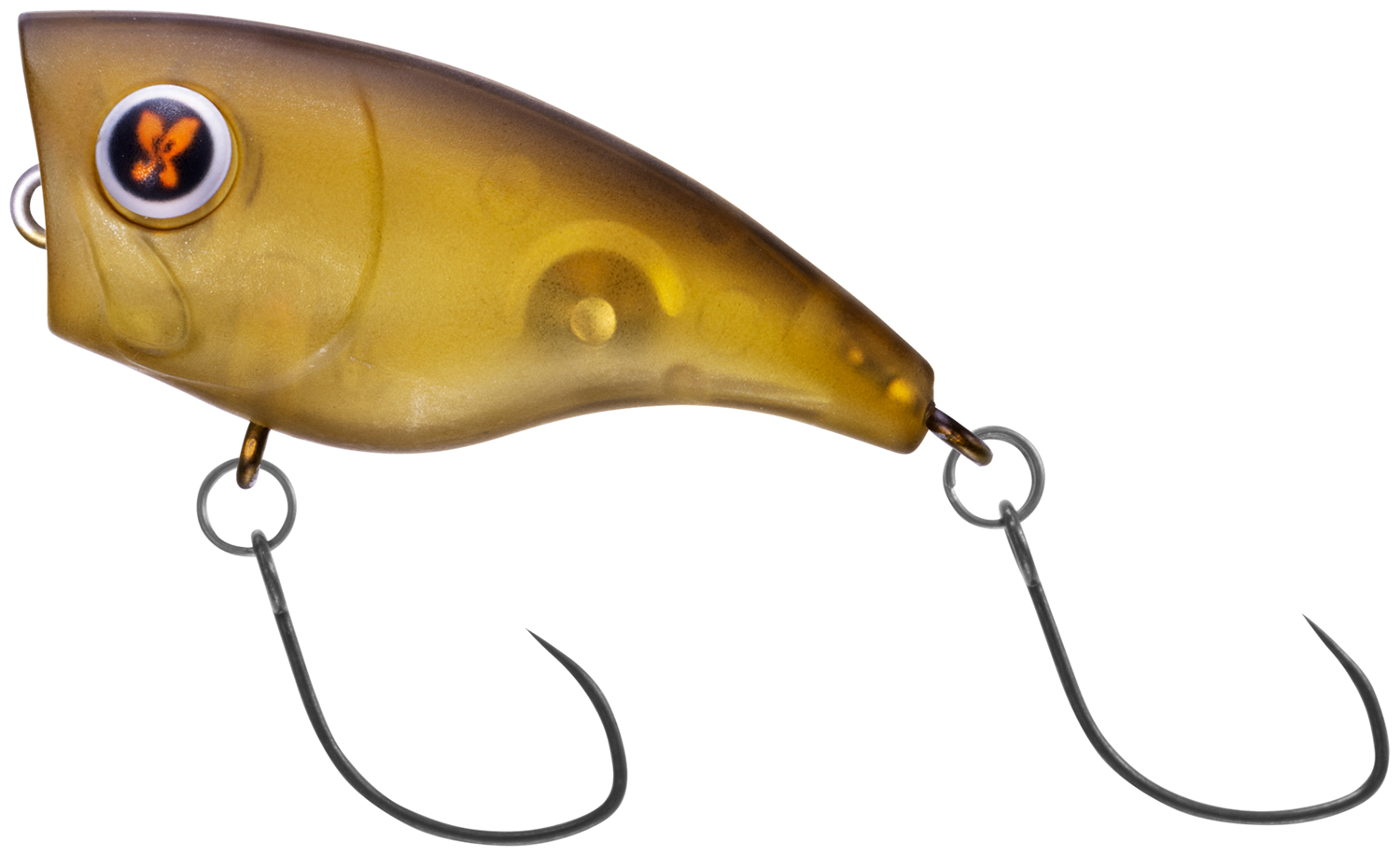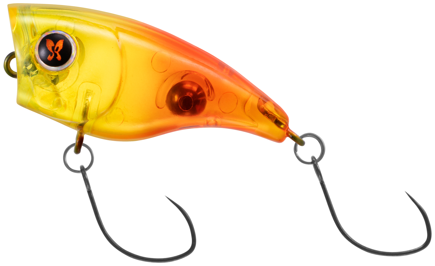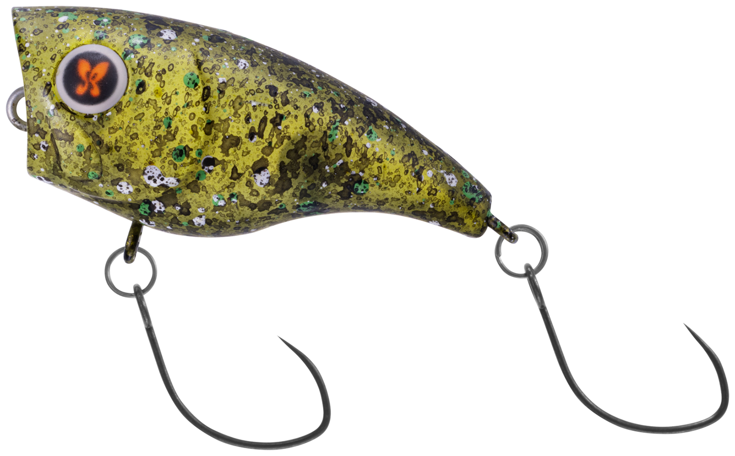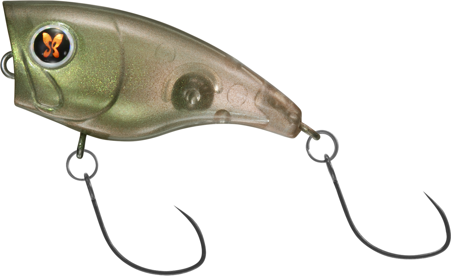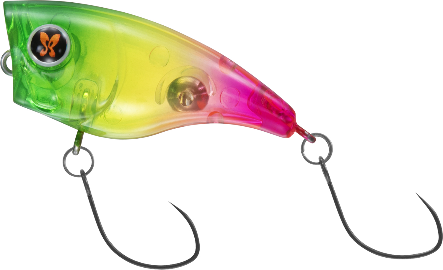 魚が違和感なく口を使いやすいスリムなテール形状と、2フック仕様により高いフッキング性能を誇り、魚を呼び寄せるだけのポッパーではなく、しっかりキャッチ出来る仕様となっている。