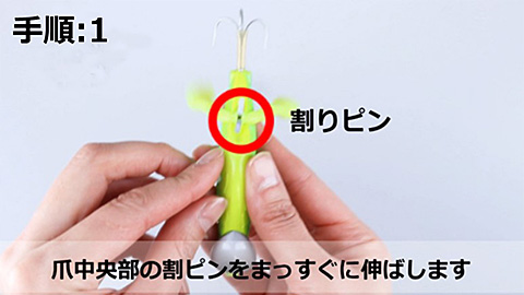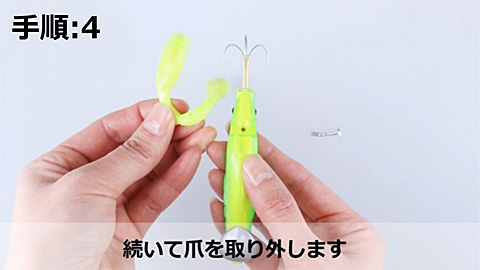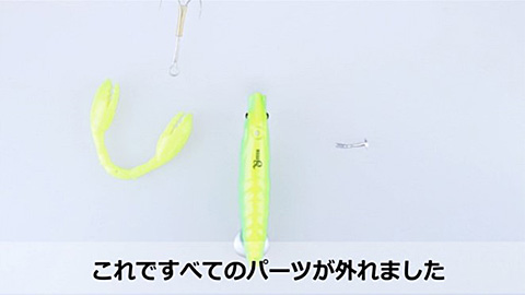 マダクは、ワーム素材でできた爪とファインワイヤーで作られた専用半傘タイプカエシ無しトリプルフックがボディに配されており、1本のアルミ製割りピンで止められている。