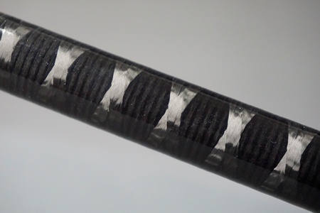 ブランクのバットセクション最外層をカーボンテープでX状に締め上げることで、ロッド操作時のパワーロスにつながるネジレを抑制するための強化構造。