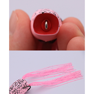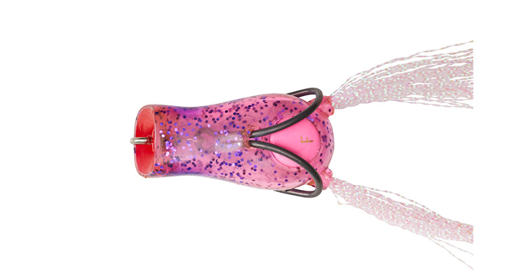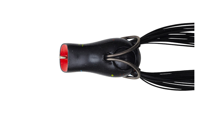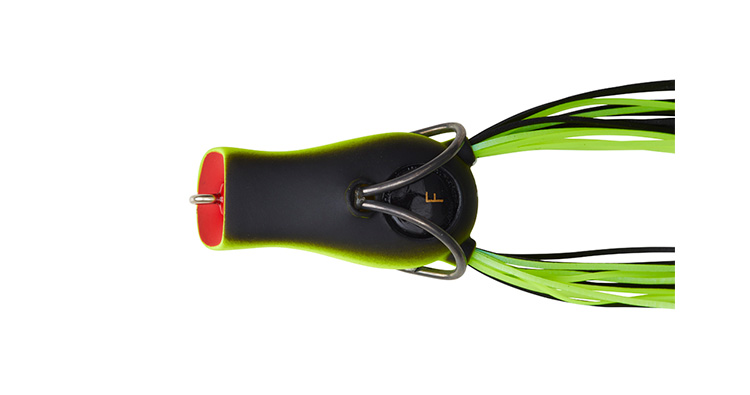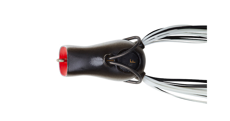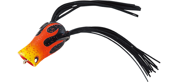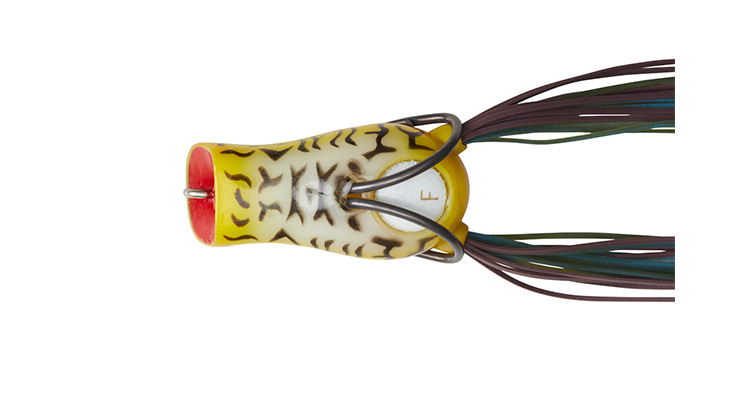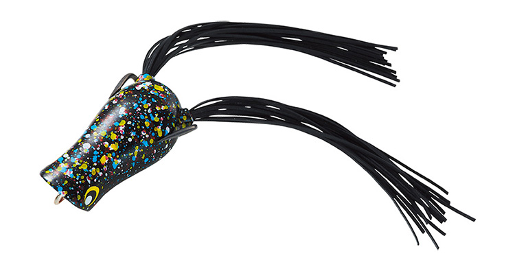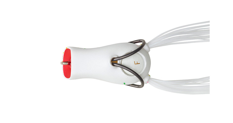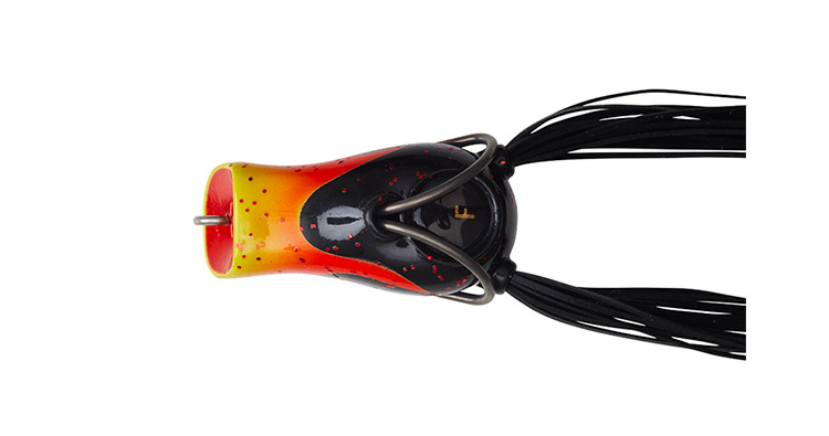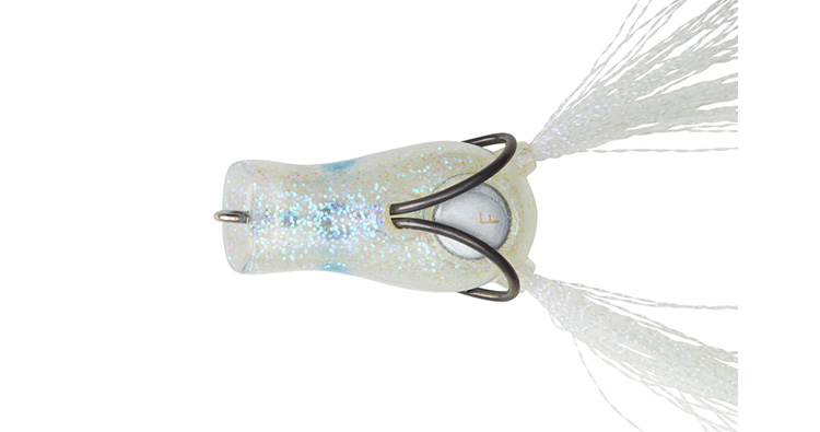 通常フロッグに使用されることの多いラバー製スカートではなく、あえてシリコン製のスカートを採用。シリコン製のスカートは、透明感のある発色の良いカラーを作ることができるというメリットがある。またラバー製スカートよりも浮力が弱いため、ボディ自体の喫水を下げ、水噛みをよくする効果も生まれる。