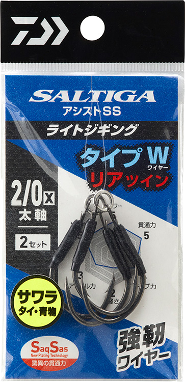 ソルティガアシストSS ライトジギング タイプW リアツイン2/0X | 約2.7 | #2/0X | 2 | ライトジギング対応の80~200g相当のジグ | 1.74 | 1,010 | 4550133251016 |