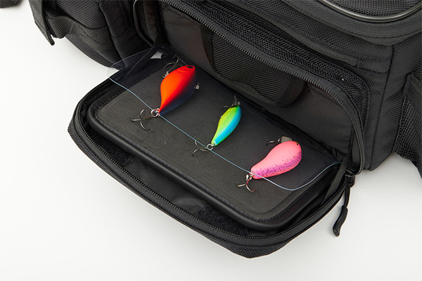 ルアーチェンジをスピーディーに行えるルアーマット付きポケット。