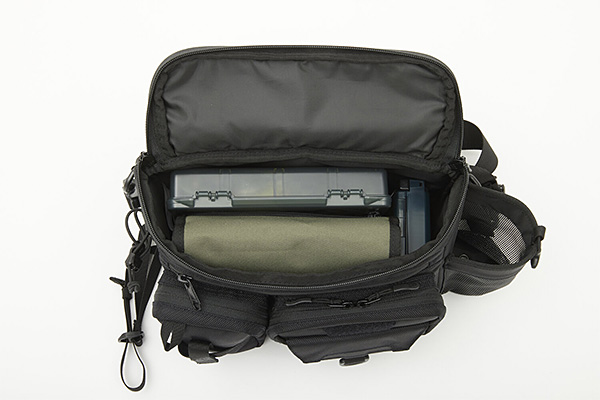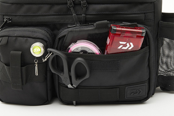 本体内部が見やすく、出し入れしやすい「大開口U字型ファスナー」を採用。頻繁に使用するルアーを収納しやすい「ルアーマット付き」フロントポケット、小物の収納にぴったりなスリットポケットも装備。さらに、コンパクトな「新構造ロッドホルダー」、針が引っ掛かりにくい樹脂製メッシュのペットボトルホルダー(600ml程度まで)、プライヤーホルダー、Dリング、ベルトループ付き。取り外し可能な大型ショルダーパッド付きで、すっきり収納できるレインカバーを内蔵(完全防水ではありません)。バッグのブラつきを抑えるウエスト補助ベルトと、蒸れを抑えるメッシュパッド背面により、快適な使用感を提供します。