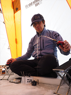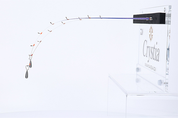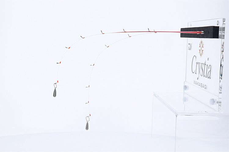 負荷が掛かると先端から徐々に曲がり、誘いでは7:3調子、合わせから巻き上げでは6:4調子へと移行する「可変アクション」を、よりシビアな状況に対応するため、さらにマイルドに仕上げたモデルです。基本設計は先調子なので誘いのレスポンスが良く、ショートハリスの「速攻」シリーズの仕掛けと組み合わせることでさらにアタリの出方が早くなり、釣果のペースが格段に上がります。また、しなやかな最先端部は桧原湖北部の当歳魚や岩洞湖の大型魚のような穂先に出にくいアタリもしっかり表現してくれる繊細さも兼ね備えています。快適なオモリ負荷は、氷上の浅場では1~3g、深場なら2~4g、ワカサギのサイズが小さければ軽めのオモリに、サイズが大きい時は重めのオモリにすると良いでしょう。また、ハイプレッシャー激渋時の屋形ドームやガン玉を使用したフカセ釣法でも高次元に対応します。