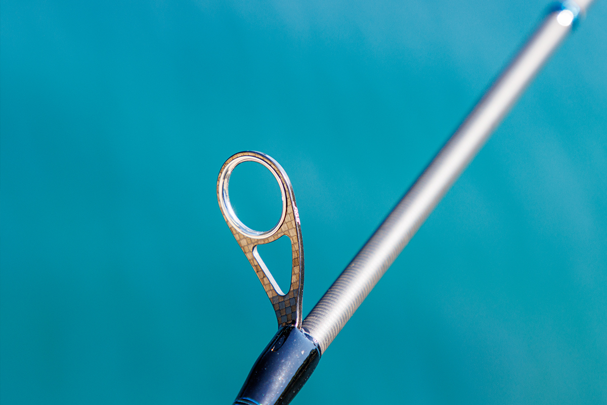 軽量・高感度を実現するAGS(エアガイドシステム)はカーボンフレームを採用しており、チタンと比較して約3倍の剛性をもつカーボンの特性から、ラインを通して伝わるわずかな信号を吸収することなくダイレクトにブランクに伝える高感度を有します。また、カーボンの軽量性によりスイングスピードの向上とティップのブレの収束の速さにより、飛距離とコントロール性能が大幅に向上します。
