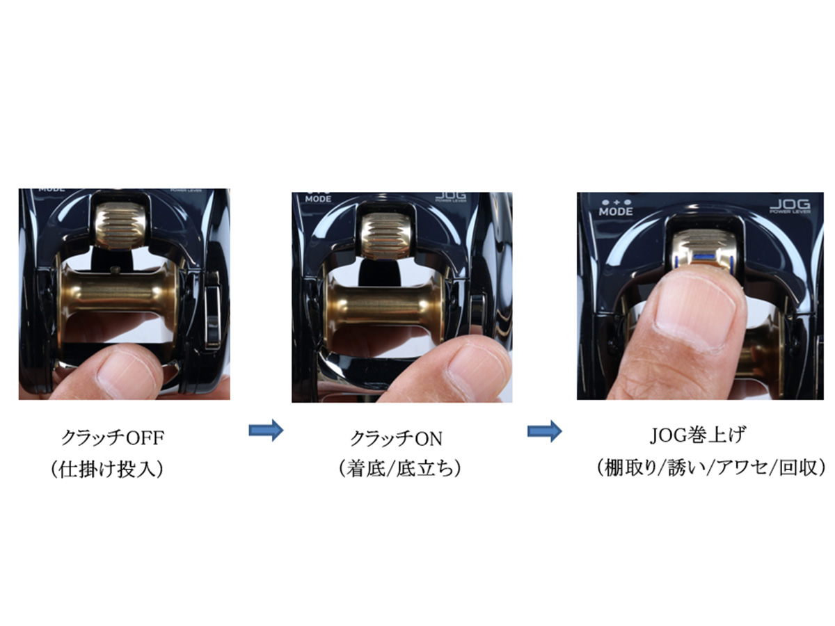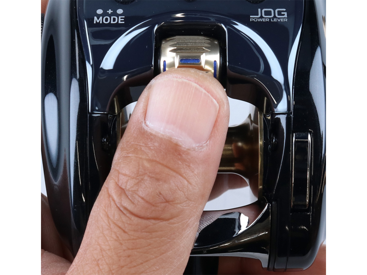 パワーレバーの位置をボディの中央に移動し、形状もレバーからジョグダイヤルスタイルに変更することにより、竿を握った手の親指一本で巻き上げやクラッチのオンオフを行えることで、空き手をレバー操作から完全に解放しロッド操作に専念できます。親指一本での自由自在な操作はレバーの微妙な操作を可能にし、巻上げスピードを意のままに操ることが可能になります。