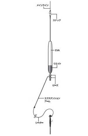 スナップ部にメインラインを結ぶ。続いて、先のエクステンションアームの先端にリーダーを結ぶ。