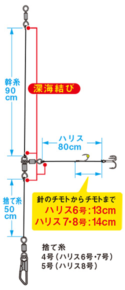 アイテム | サイズ | フック(針)サイズ | ハリス号数 | 幹糸(号) | ハリス長さ(cm) | 入数 | 幹糸長さ(cm) | 全長(cm) | 捨て糸(号) | 枝ス長さ(cm) | 枝ス(号) | メーカー希望本体価格(円) | JAN |