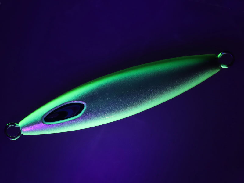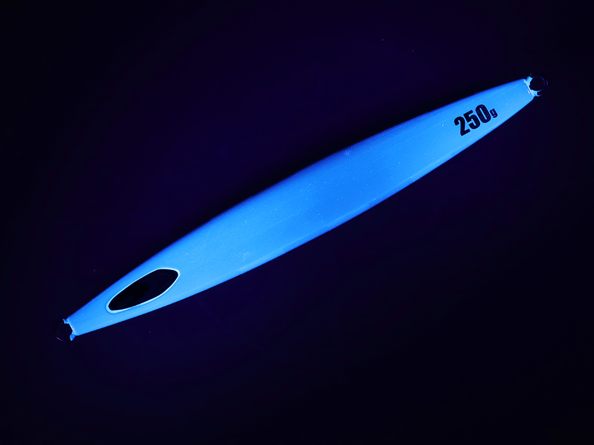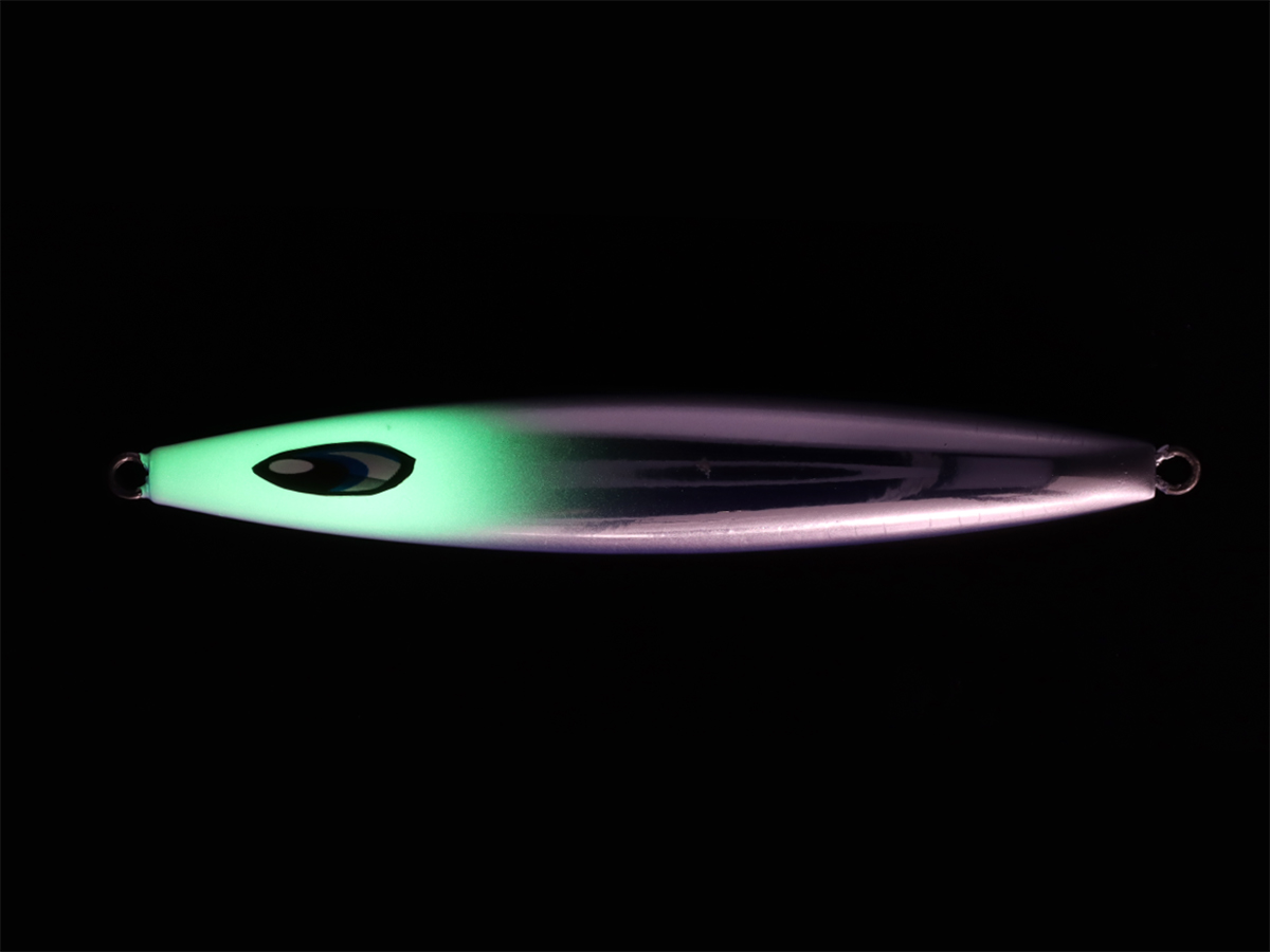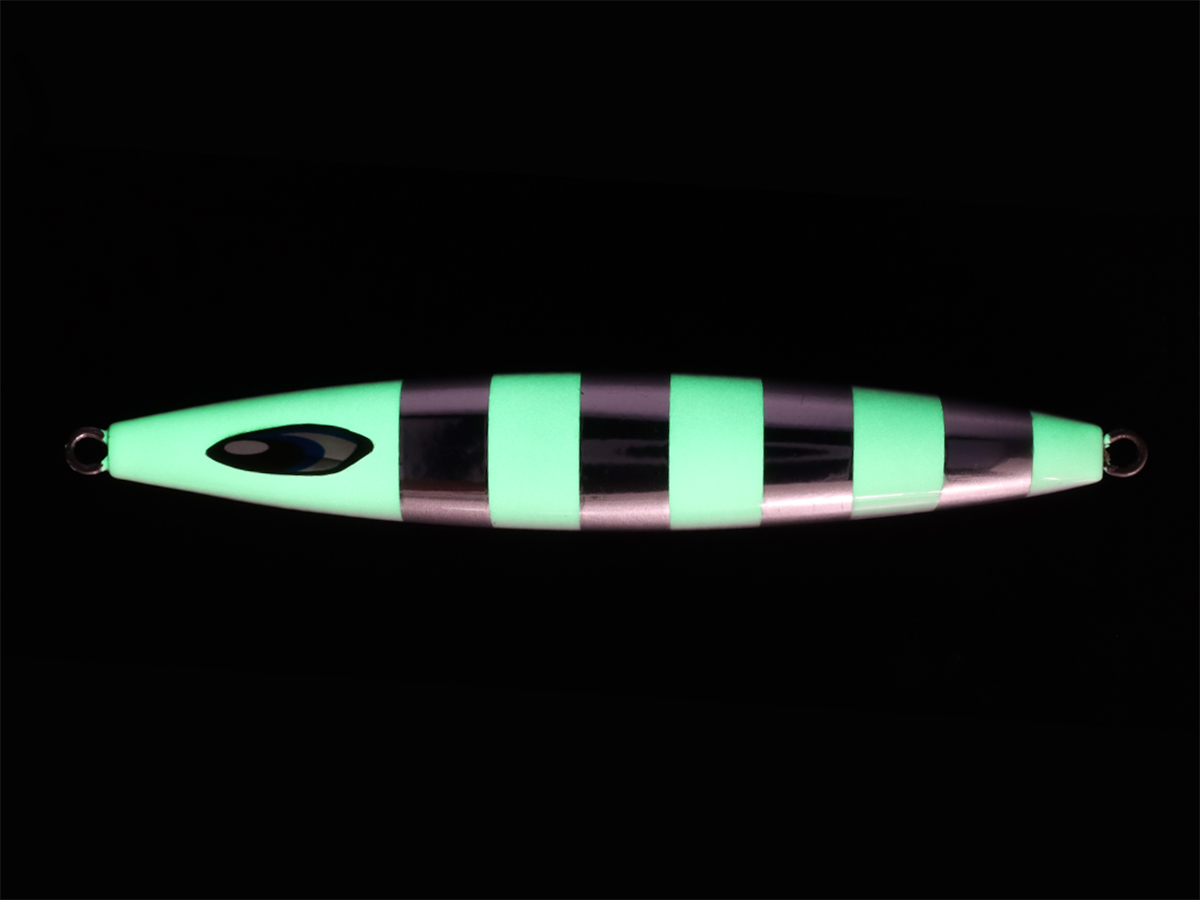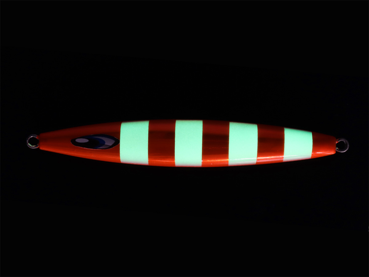 オレンジはカンパチを、パープルはマグロ系とか深場のアカムツを意識して作りました。ブルーグローは1番発光力が強いので、オールジャンルに使えるカラーです。とくに深場を攻めるときに活躍してくれます。ゼブラの幅にもこだわっていて少し幅広にしているのも実は僕のこだわりなんですよ。ゼブラの反対面は、すべてシルバーケイムラカラーなので、アピール力が高い3色だと思います。
