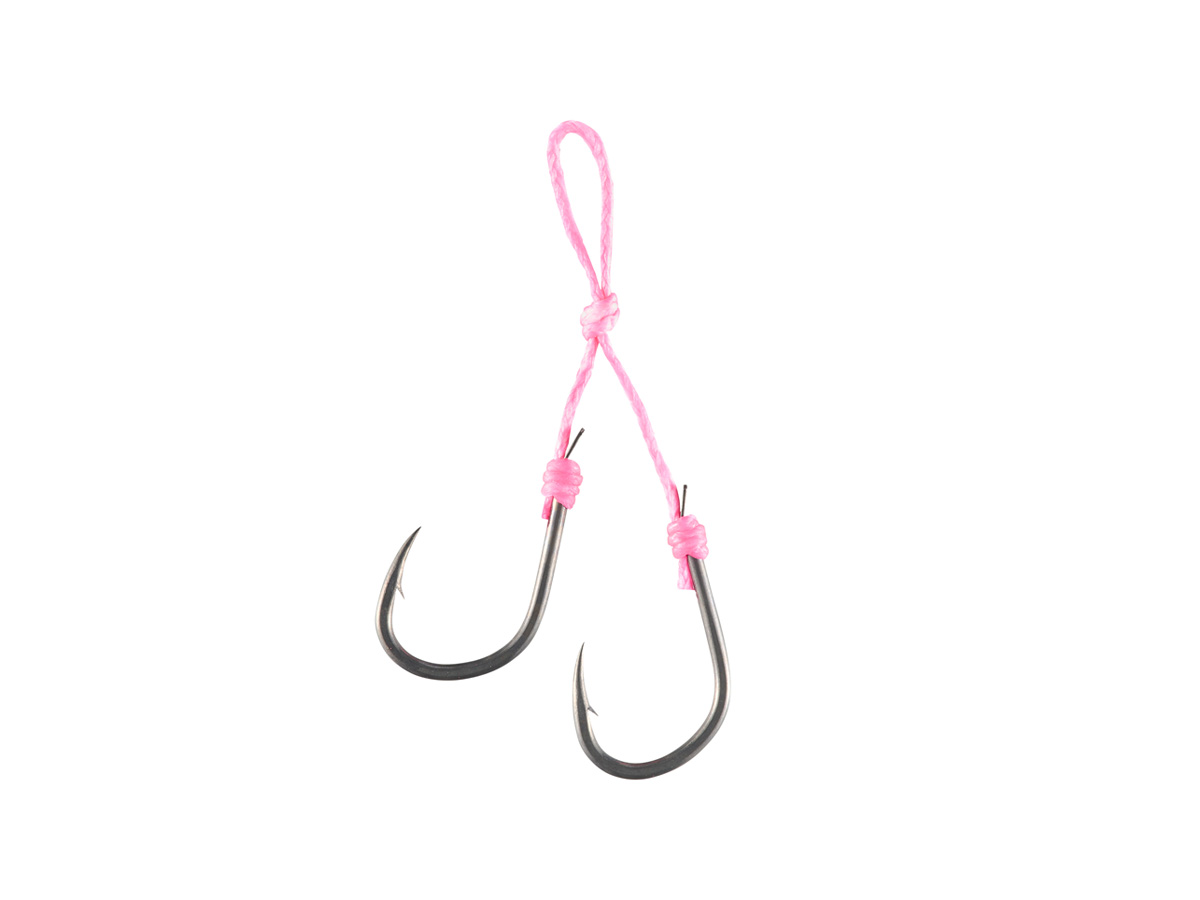 アピール重視のケイムラピンクフック(下針)で誘い、貫通力に優れたSaqSasフック(上針)で食わせる段差仕様。