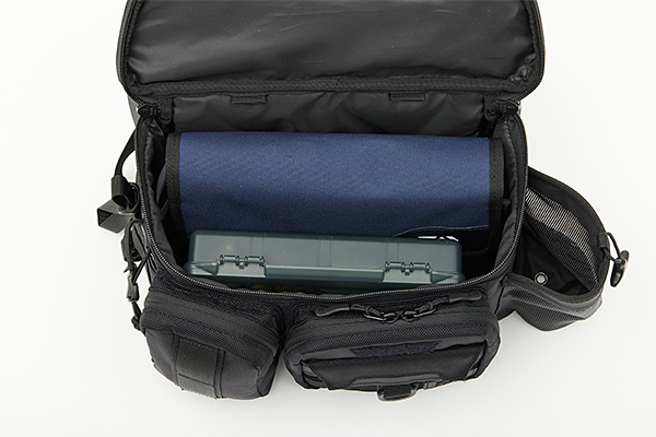 ルアーチェンジをスピーディーに行えるルアーマット付きポケット。ルアーマットは取り外し可能。
