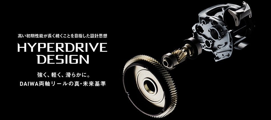 強く、そして滑らかな回転の永続。 それこそがベイトリールに求められる機能の帰結。 ドライブギアからピニオンギアへ絶え間なくエネルギーを送り続けるパワーユニット。 内なる漲りを外から確実に押さえ込み、安定かつ静粛な駆動力を実現する堅牢なボディ。 そして如何なるコンディション下でも機能するファンクショナルな各機構。 無駄なく効率的、それでいて従来の枠を遥かに超えたハイパーなドライビングを実現する両軸リールの設計思想。 経験を武器とするDAIWAが次なる未来基準を作る。 ![]() ![]() リーリングに際して、主に4つの最先端テクノロジーが互いに密に連携することで生み出される快適性能こそが『HYPER DRIVE DESIGN』。DAIWA両軸リールは、そのいずれをも内包することで、まだ見ぬ次なる時代のルアーフィッシングをリードしていく。 ハイパードライブデジギアは、歯面の噛み合い率の向上を目指した圧力角が優れた回転フィーリングと耐久性を確立。ピニオンギアとハイパータフクラッチは過酷な使用条件下でも不測の事態を見据え、強力なタッグを組み上げた。またハイパーアームドハウジングは、それらすべてを包み込み金属ならではの剛性による安定感を発揮。 どれひとつを欠いてもシナジーは共有できない。スーパーを超えるハイパーの領域は、4つの機能が互いの長所を極限まで活かし切ることで実現可能となる。三位一体ならぬ四位一体が立ち上げる、新たなるDAIWA両軸リールのコンセプト。伝説が再び始まろうとしている。 |