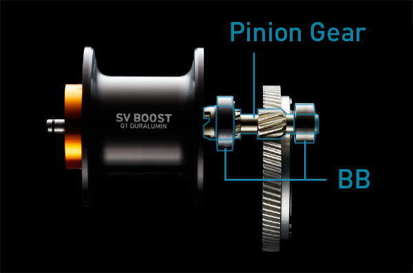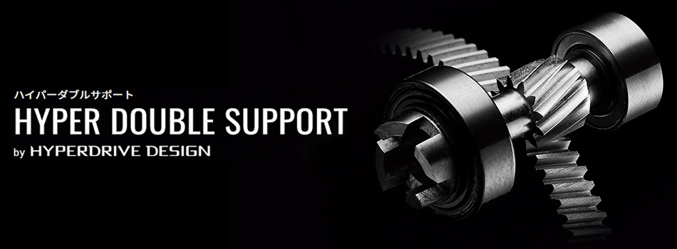 ピニオン軸の両端をボールベアリングが支持することで、優れた回転性能をキープ。ドライブギアのパワーをスプール回転へと変換する中間軸・ピニオンギアの新たな構造は『HYPER DOUBLE SUPPORT』と呼ぶ。