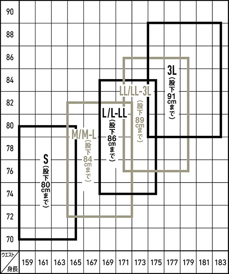 アイテム | S | M | M-L | L | L-LL | LL | LL-3L | 3L |