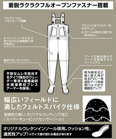 不快なムレを低減するダイワ独自のウェーダー専用4層構造防水透湿素材『ブレスアーマー』採用。