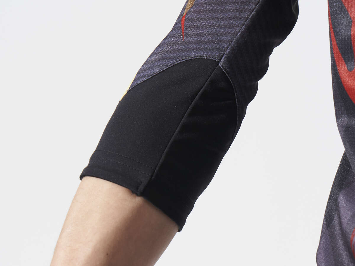 フローティングベストと重なる身頃と汗をかきやすい脇下部分は吸水速乾素材、外側に出る袖部分は防風・撥水素材を組み合わせることで快適な釣行をサポート。手首周りは、腕をまくった際もぴったりとフィットするようストレッチ素材に切り替えている。