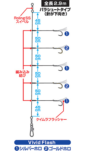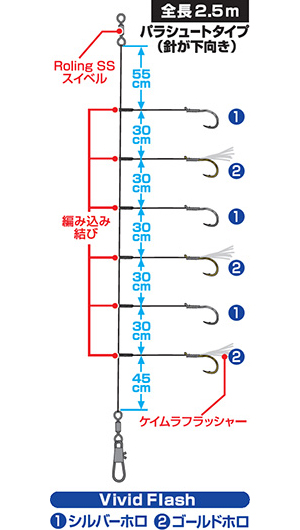 エサがアジベイトメインの場合は、金メッキカラーがより掛かりが良いことが多い。またビビッドフラッシュ ホロタイプにもゴールドのホログラムシールを一部の擬餌に採用した仕様。