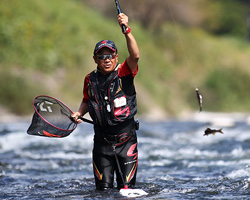 まず、とにかく釣れる竿。長良川郡上のテストでは爆発的な釣果を出せた。ゼロテンションを何段階にも細かく調整できるからゼロテントレース釣法(詳細はP25)も生まれたし、絶妙にオトリがついてくる。実はYouTubeで少し紹介したんだけど話題沸騰で、一緒にテストした瀬田君も27cmを仕留めた。九頭竜川の坂東島の流心でも25cmに対応できたし、正直…この竿は発売したくない。腕の差がなくなるからね(笑)。