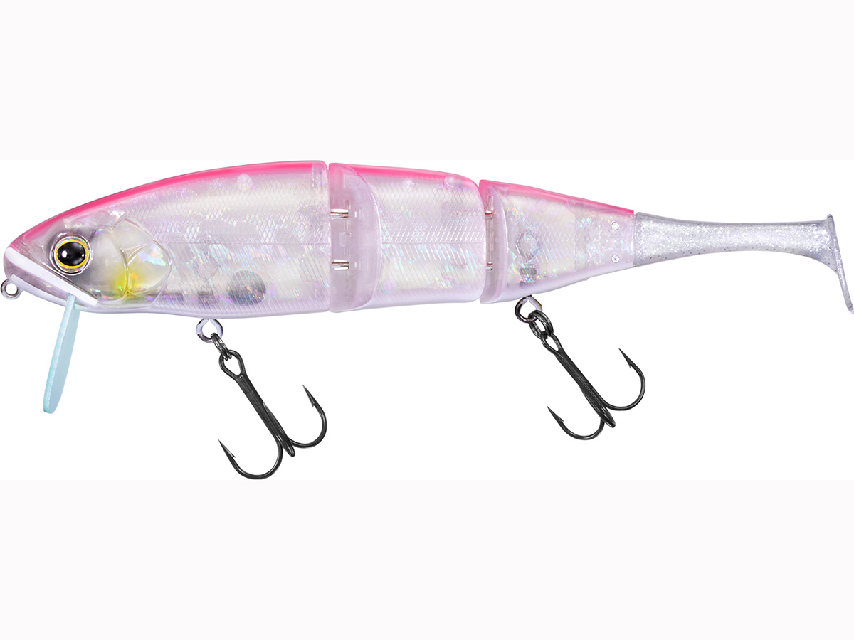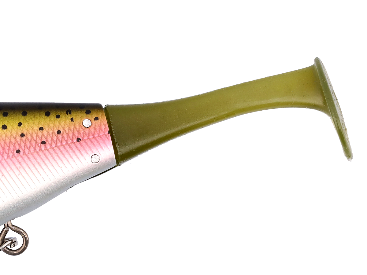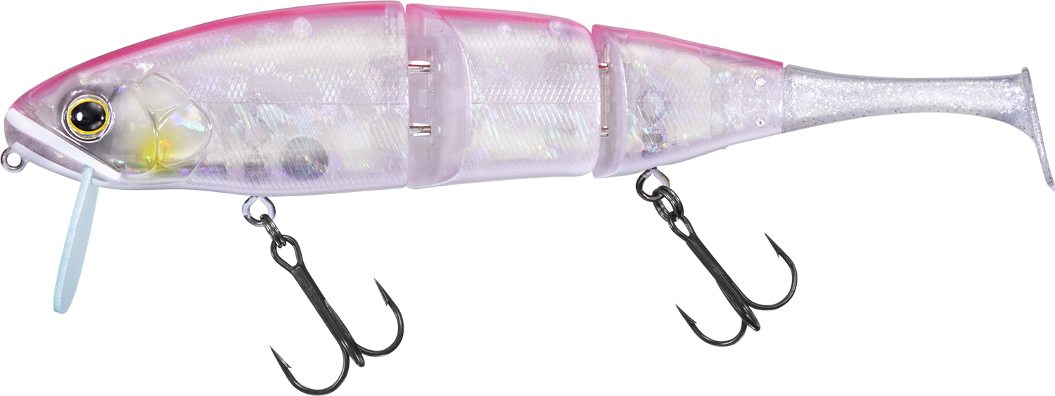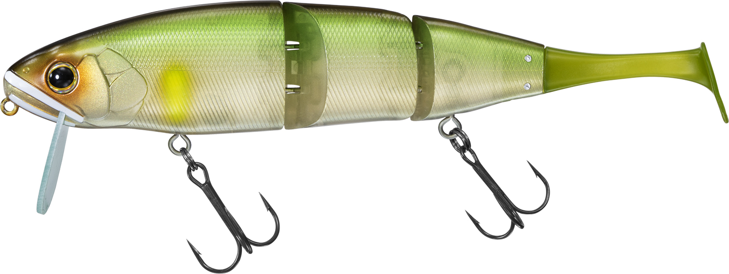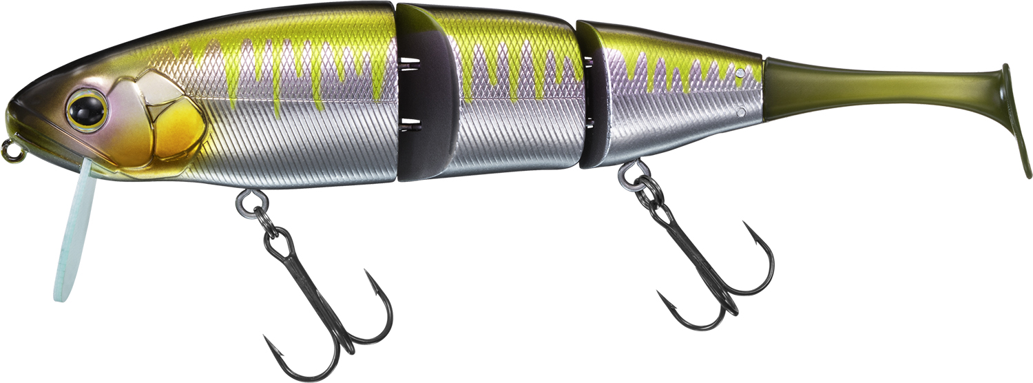 3連ボディはクランクベイトよりも水押しが弱く、ビッグベイトでありながらナチュラルに攻めることができる。テールはハイレスポンスに設計し、特に首振り時に時間差でブルブルッとアクションし喰わせの間を与える。