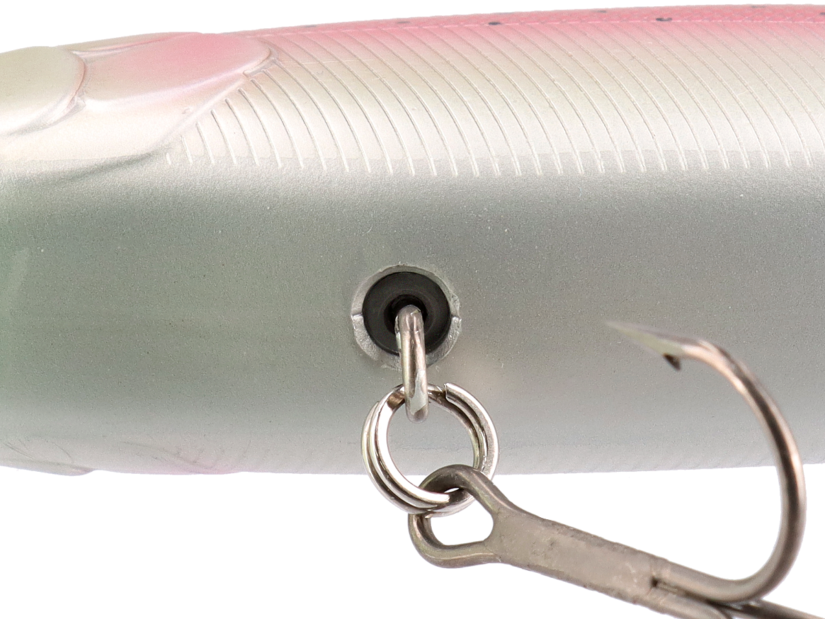 フックアイには、サクサススイベルを採用。ビッグベイトはそのボディの大きさから抵抗が掛かりやすく、自重もあるため、バスが暴れるとテンションが一気に抜けてしまい、バレやすいのが弱点。