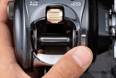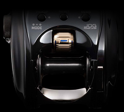 パワーレバーの位置をボディの中央に移動し、形状もレバーからジョグダイヤルスタイルに変更することにより、竿を握った手の親指一本で巻き上げやクラッチのオンオフを行え、空き手はレバー操作から完全に解放されたのである。竿を握れば親指は自然にボディ上部へ添えられるので人間工学的にも無理がない。『ジョグパワーレバー』が親指一本での自由自在な操作を可能にした。