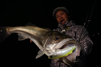 大野が「3Dダート」と呼ぶ、ミニエントのダートは、「流れが緩んでも、ベイトのイメージが残っている魚」には、恐ろしいほど効果的。そのロッドアクションから、デイのメソッドと思われがちだが、運河の明暗のような、「タメを作りたい」時には絶対に試して欲しい。流れが緩み「もう時合いが終わりか」とも思えるポイントからも、これなら、バイトを引き出せる場面が少なくない。狙ったレンジまで沈め、ラインスラックを入れた「パーン、パーン」というスローなワンピッチジャークで操作する。ダート後の絶妙のフォール姿勢と沈下速度がバイトを誘い、スラックがあるので、バイトも深く「獲った!」という満足度も非常に高い。