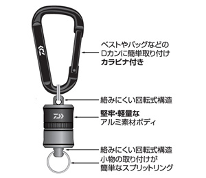 ベストやバックのDカンに簡単取り付けるカラビナ付き。
