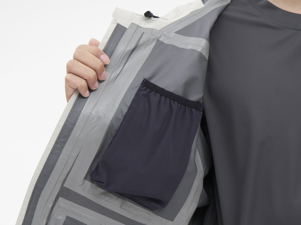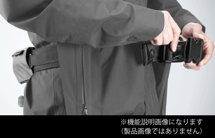 バックパックのウェストハーネスを付けてもポケットが塞がらないようにポケット下にベルトを通せる設計。耐久撥水性があり、撥水効果が持続するため、生地が水を吸い込みにくく、いつまでも快適に着用可能。生地の裏側にはザラザラとしたプリントを施すことで、濡れた際にも肌に張り付きにくく、快適に着用可能。