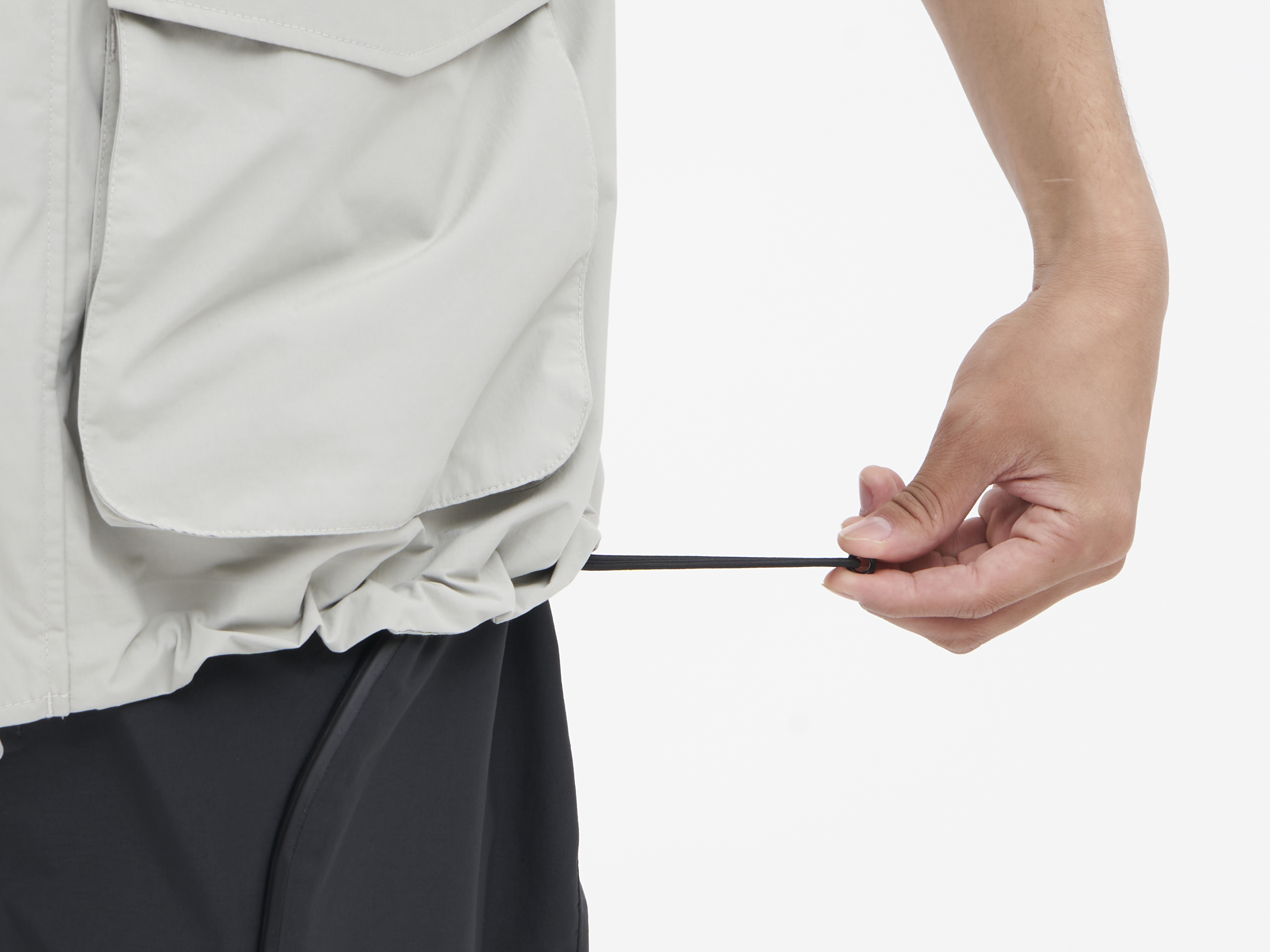 フード後方のドローコードを引くことでサイド部分が持ち上がり、視界の範囲を広げます。雨天時の視界確保のためには状況に応じて調整することが必要です。