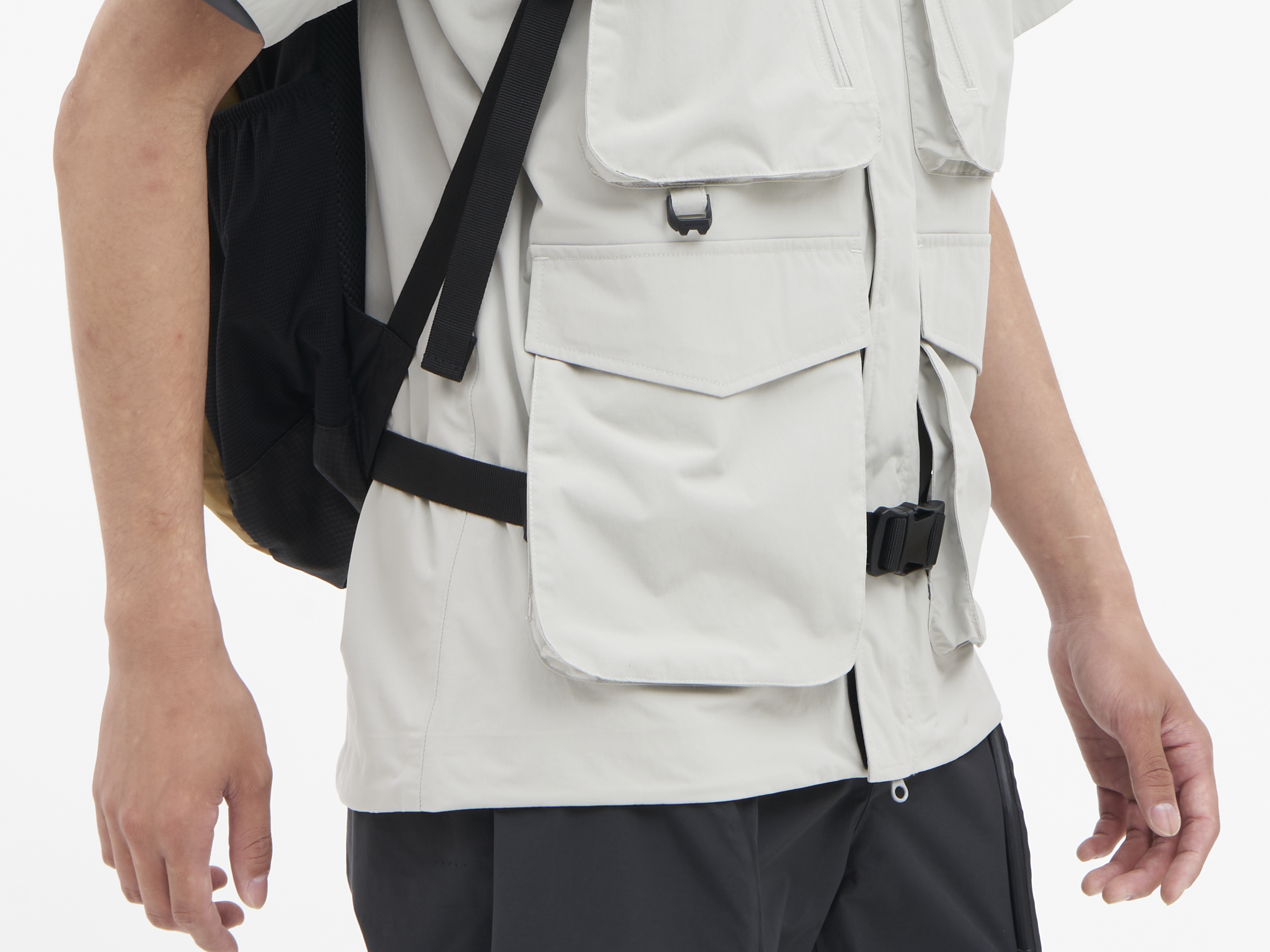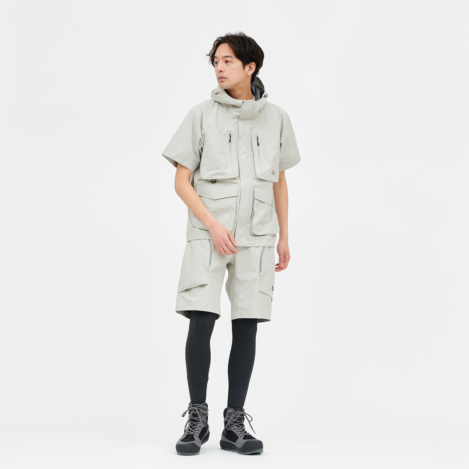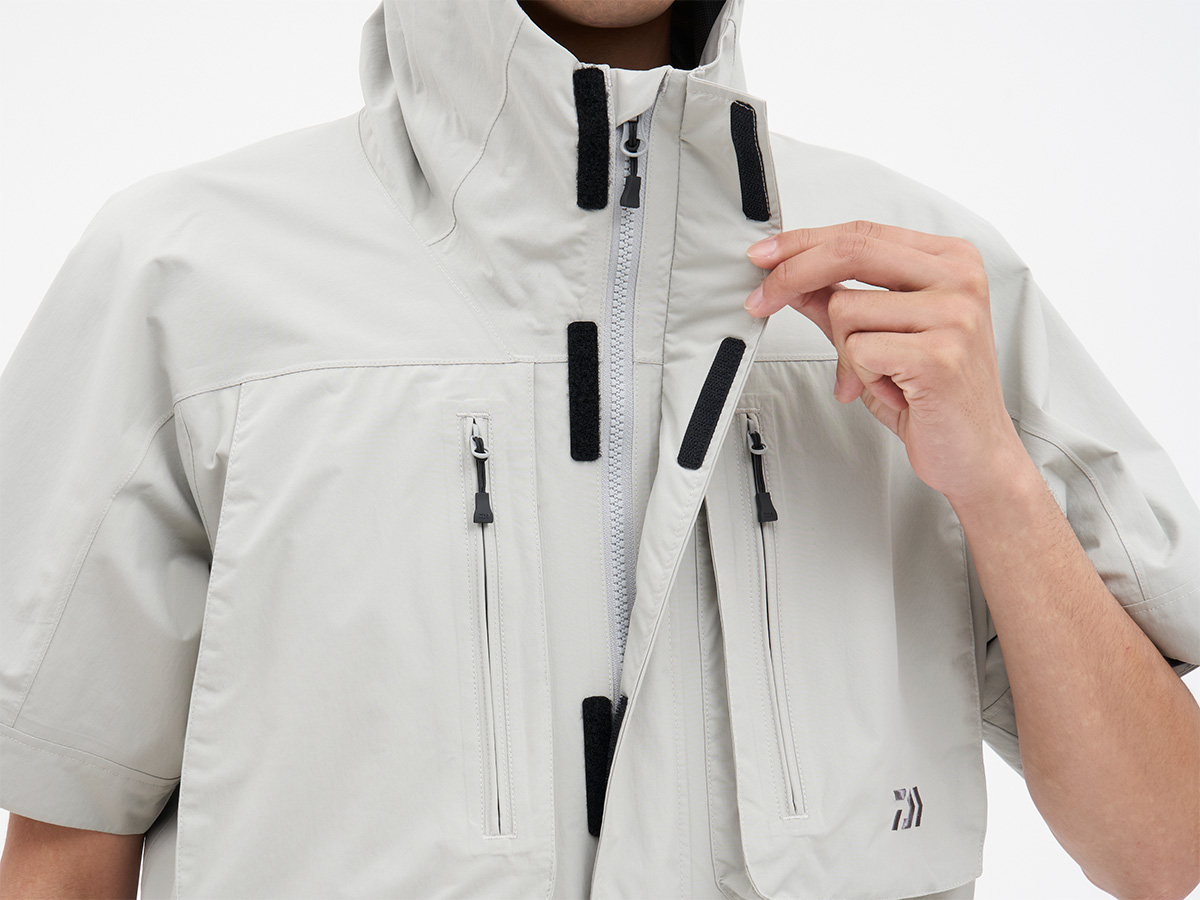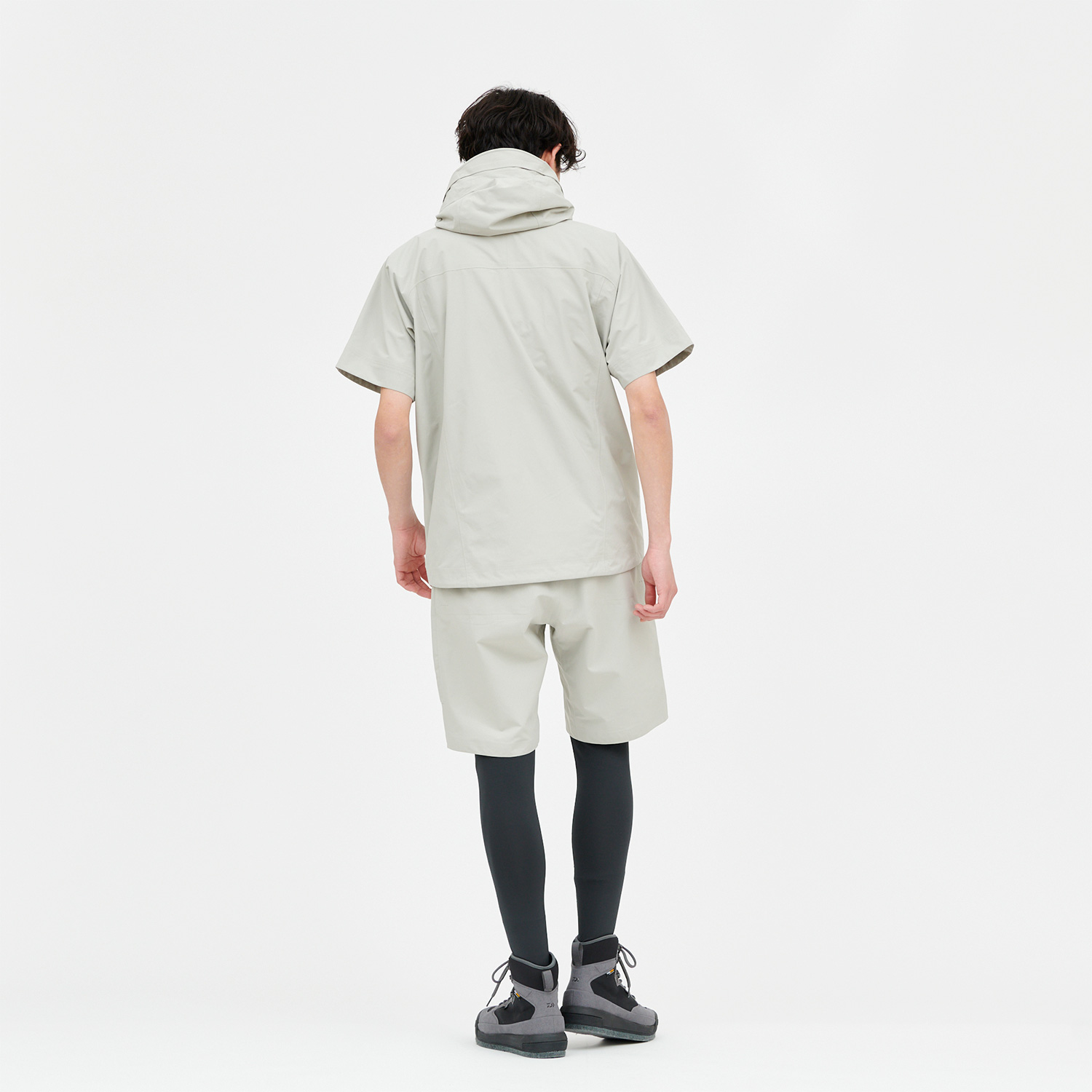 蒸し暑い雨の日に、身頃だけが濡れないようにした半袖レインジャケット。手を水中に入れることの多い渓流では、レインウェアを半袖にすることで、濡れたくない身体だけを守ることができ、快適に着用可能。半袖にすることで通気性を確保し、動きまわる釣りで快適な衣服内環境を保つ。