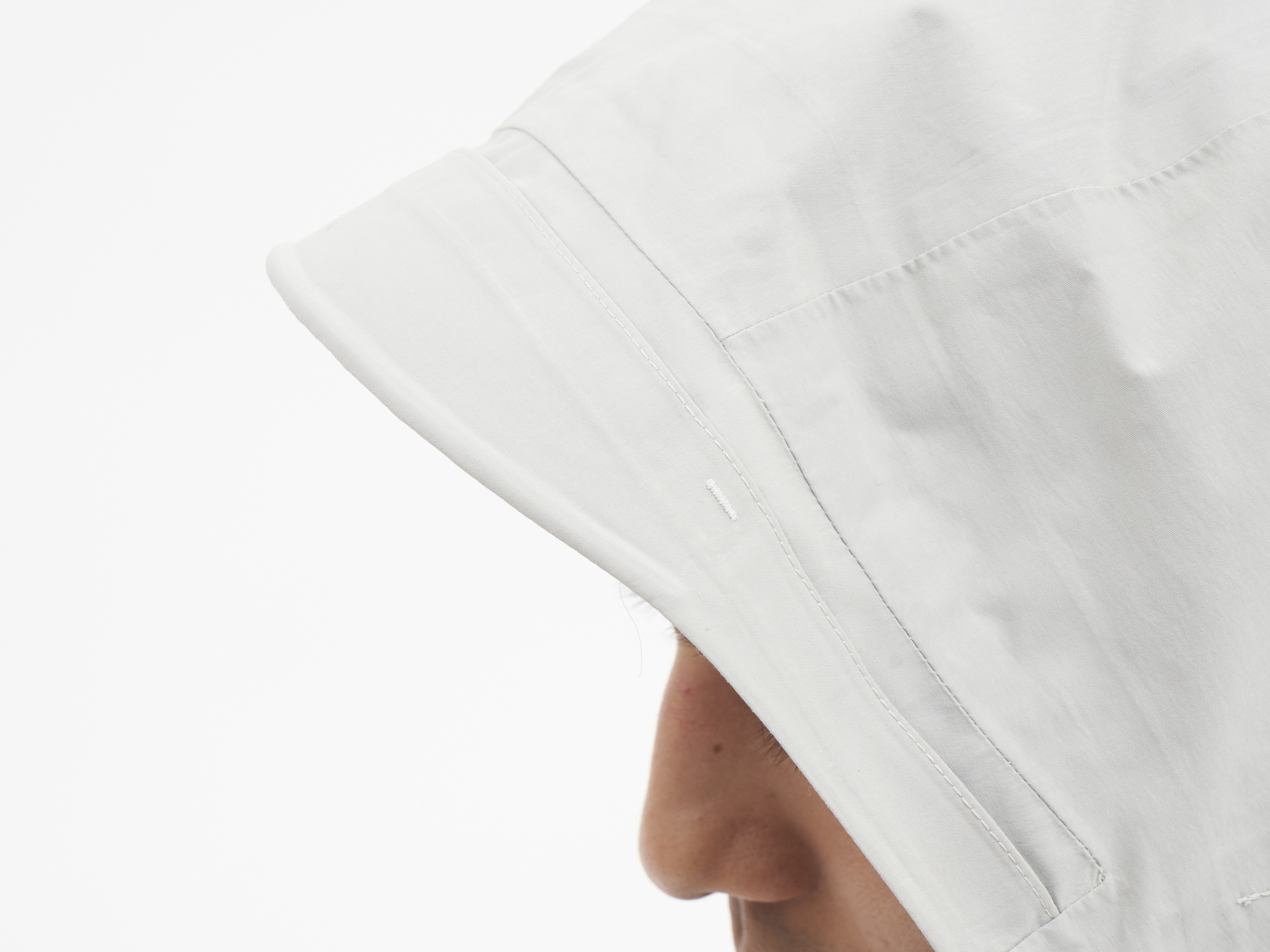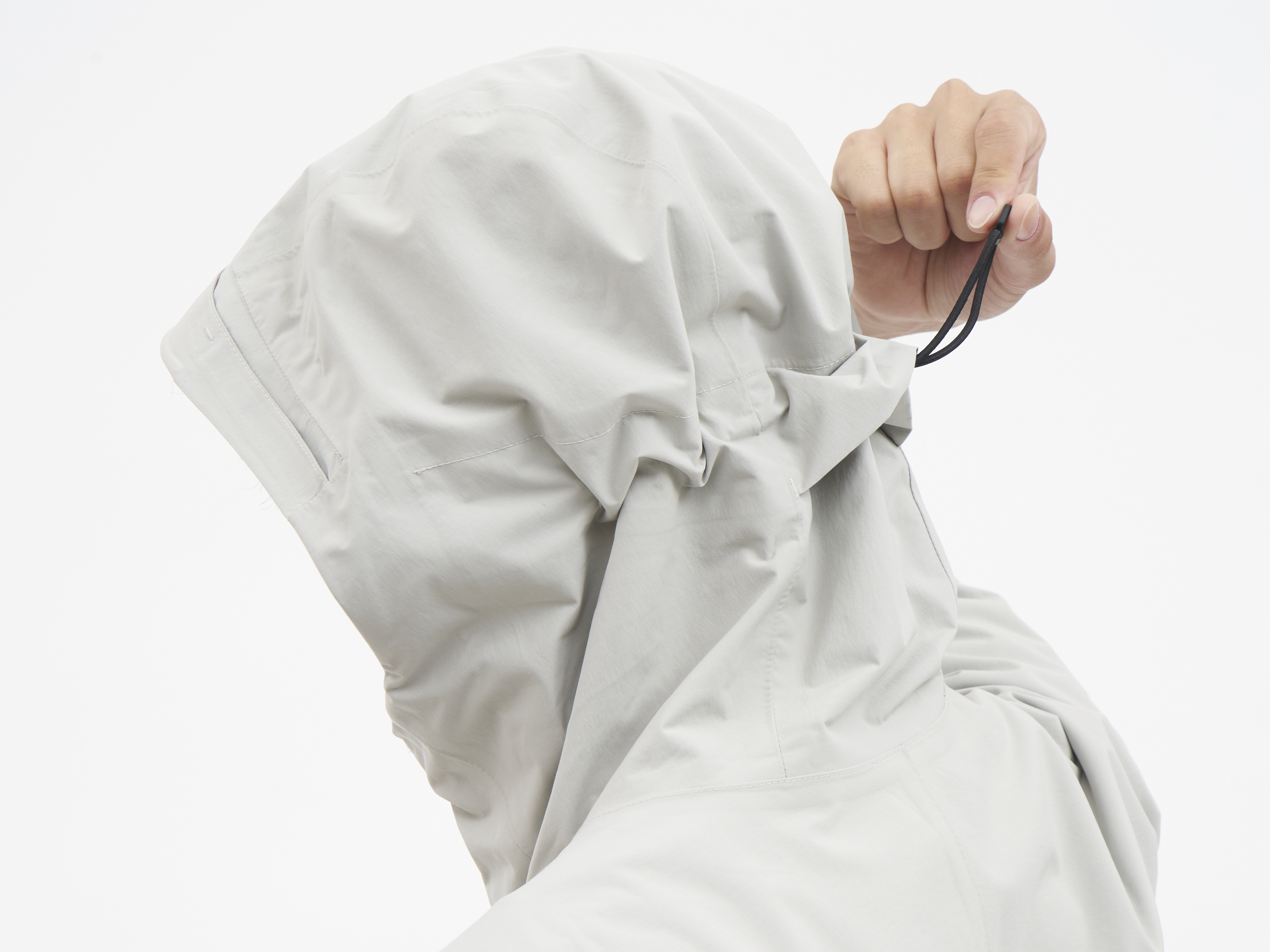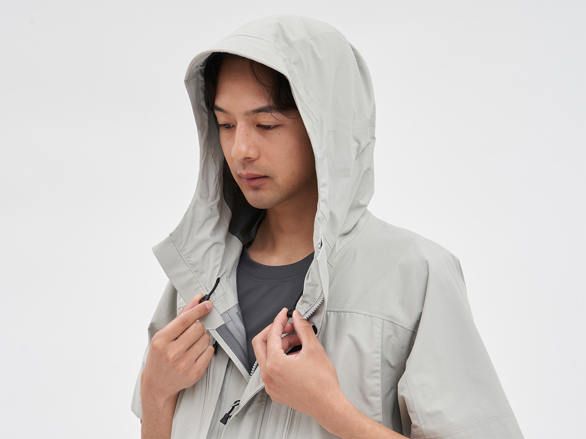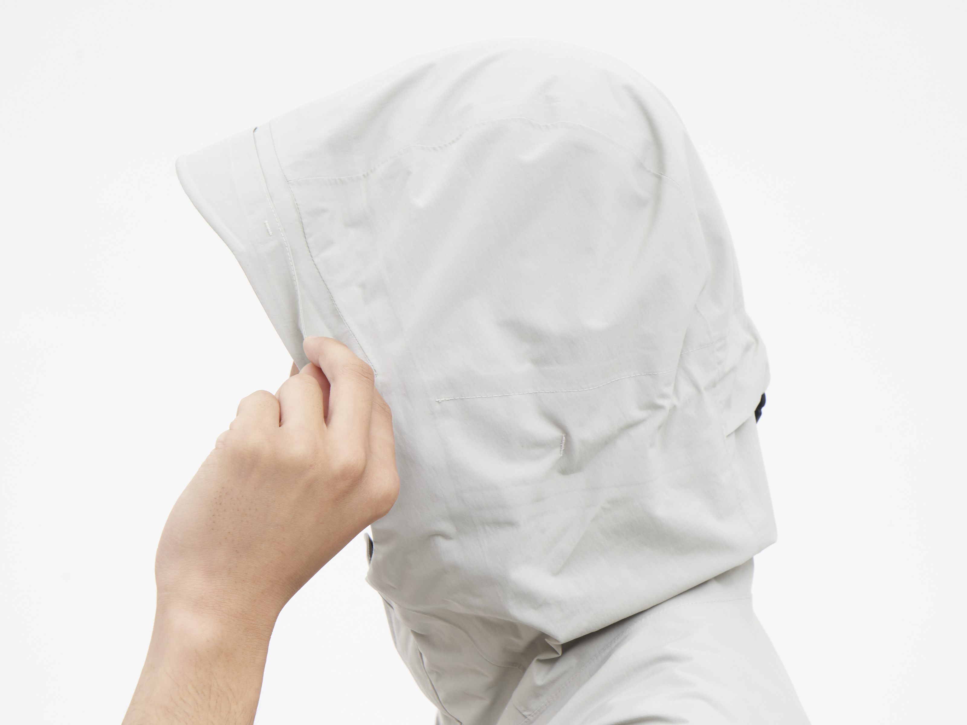 フードの顔に近い縁を折り返しにすることで、雨滴の浸入を軽減します。